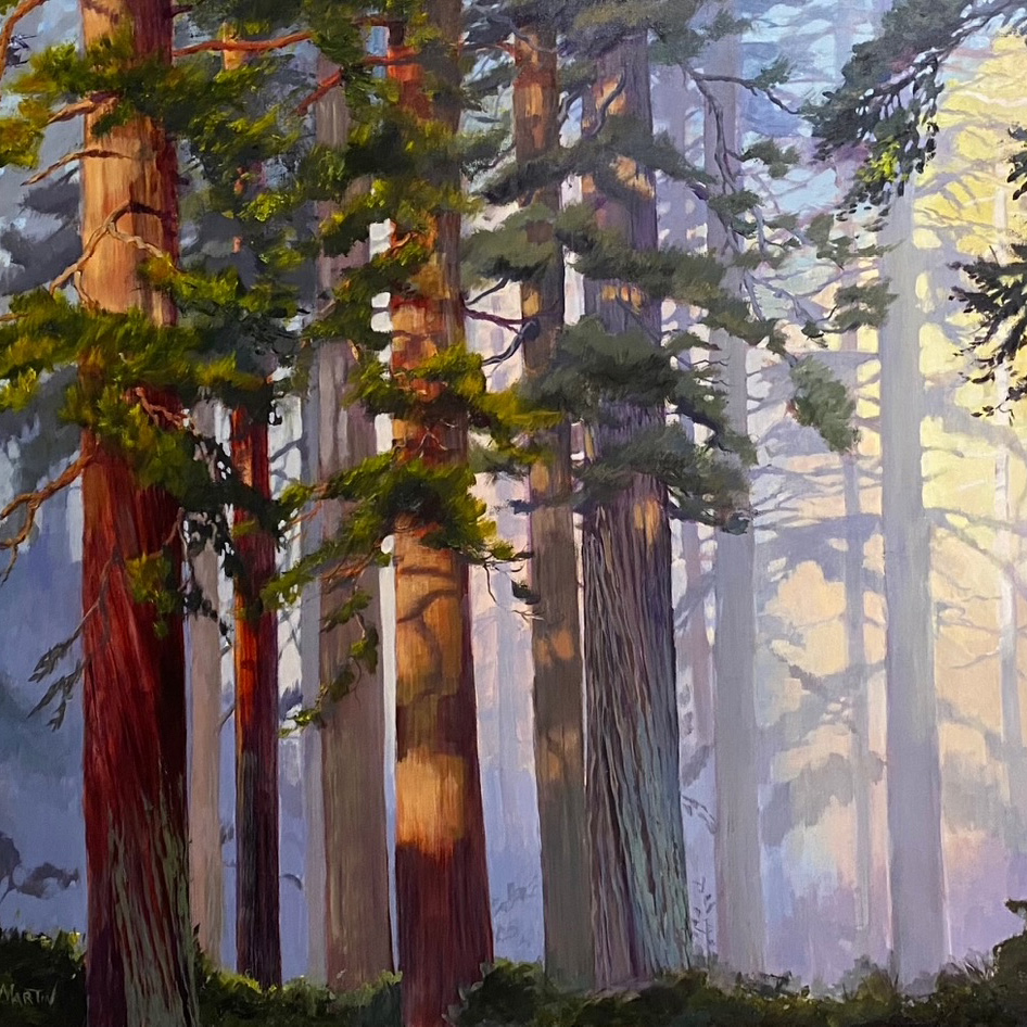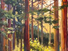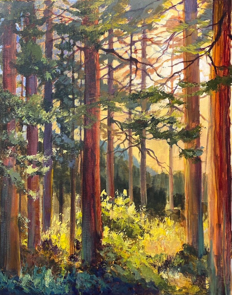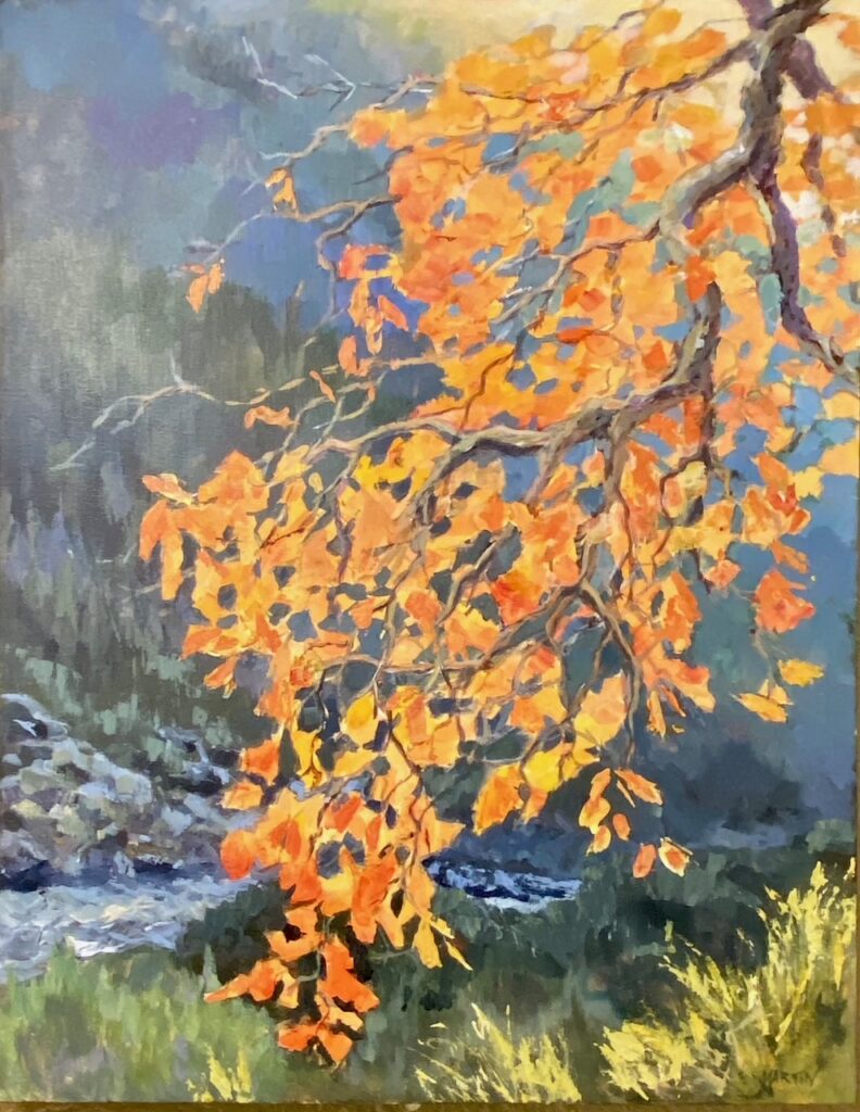“For the Love of Light”; is the reason Candi Martin Baker attempts to convey the effects of light, water and air movement on the trees and and plants found in the natural world. Her current style was achieved by over 20 years of experimenting with oil, watercolor and acrylic mediums and attending workshops by artists she admired. Martin Baker hopes the observer will feel a sense of peace, and awe in the world around us.
