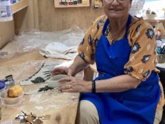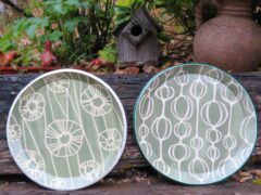 A slab of clay is my blank canvas. My favorite art tools consist of found objects that will make a mark: dried seed pods, weeds, ferns and grasses, as well as vintage lace, ribbon trim, old tools, kitchen gadgets and the like. I’m always looking for what will make a special texture on the clay as well as small rusted metal pieces I can incorporate on mixed media work.