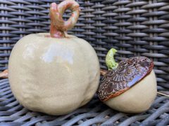 I enjoy making functional pieces that include mugs and cups, bowls, trays and trinket dishes. I let my imagination wander when creating my pumpkins and acorns, wall hangings, bells, wind chimes and ornaments- all with different layers of texturing, under glazing and glaze combinations.