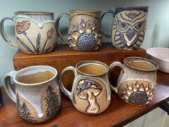 All items are handmade with thought and intention for the user. I believe the items we use everyday should be both useful and beautiful as beauty brings joy into our lives. I make a variety of functional work including platters, bowls, vases, planters, salt cellars, garlic keepers, butter dishes, sponge holders, spoon rests, jewelry dishes, luminaries, votive holders, tumblers, and my very favorite thing to make – colorful one of a kind mugs. Often hand carved or decorated with appliqués, these mugs are sure to bring a smile to your face.