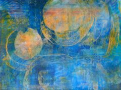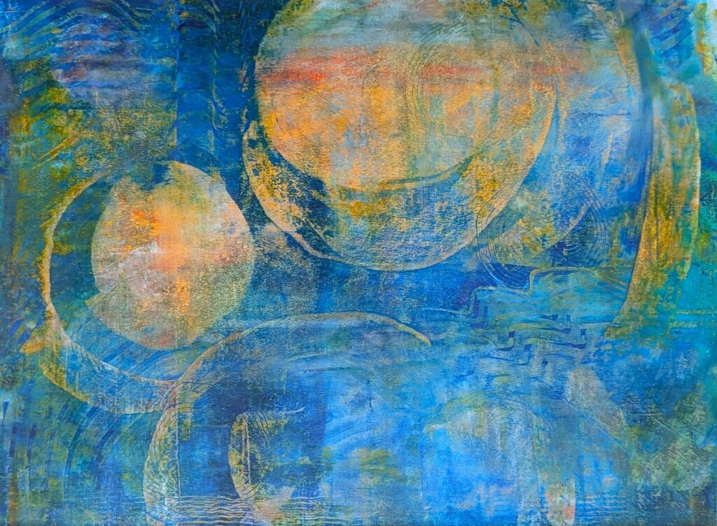 My art is always evolving, exploring different ideas, colors and techniques. I am now obsessed with using water mixable oil paints and cold wax medium. The oil paint and wax are smushed together on a palette and applied with knives, scrapers, sponges and brushes. It is like painting with soft butter, creating smeary, translucent layers of unique blended colors. Powdered marble, pigments, paper and fiber can all add heavy texture and depth when combined with the waxy paint.