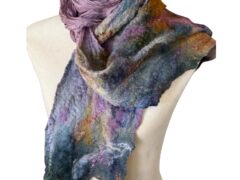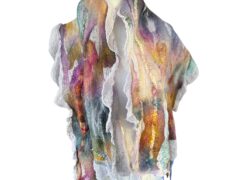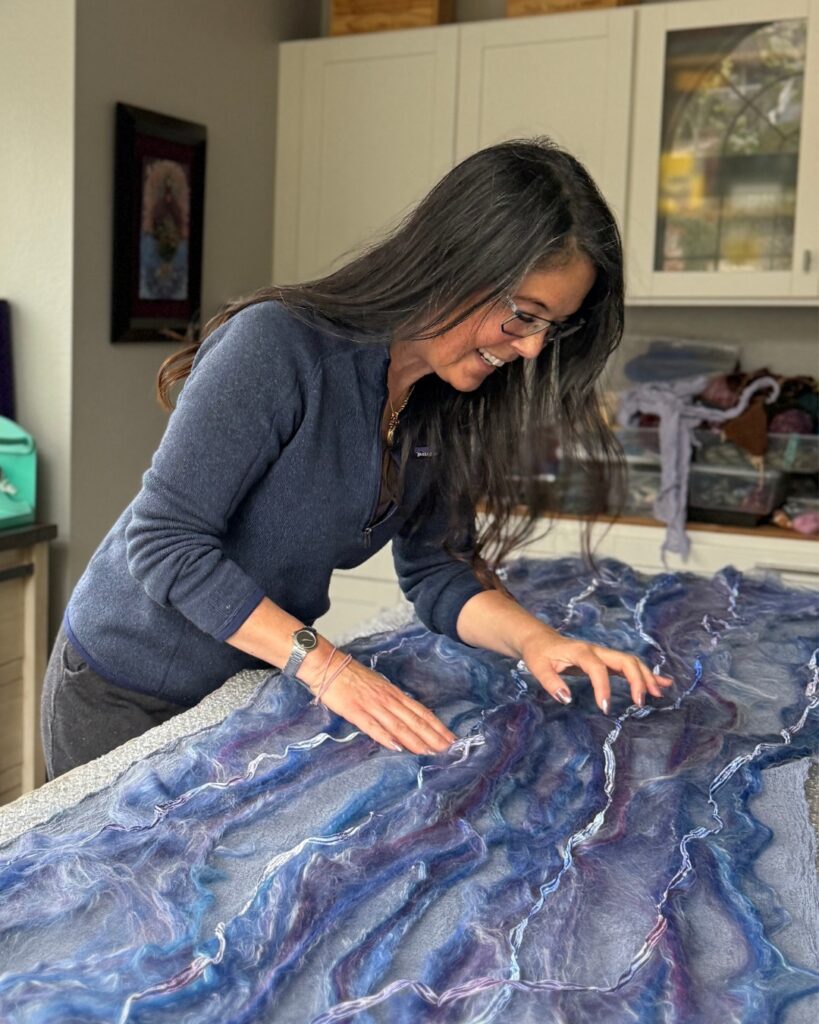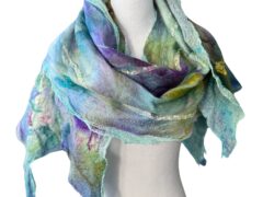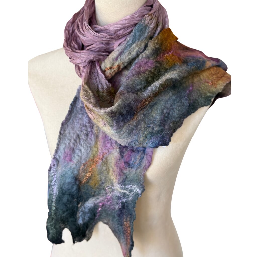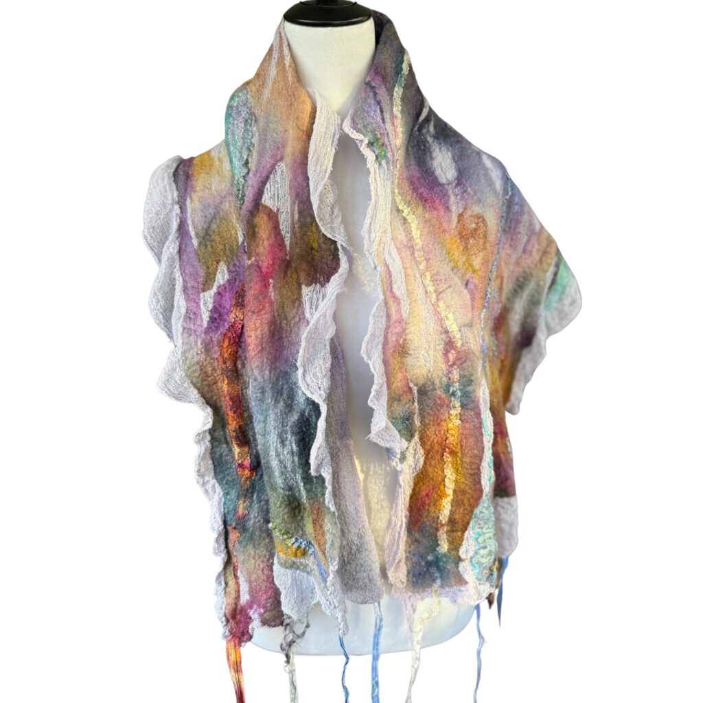 Painting with wool is like painting with clouds — soft, shifting, and alive with possibility. Using the ancient art of wet felting, I blend color, texture, and movement into pieces that are both delicate and surprisingly strong. This balance between beauty and resilience has become a signature of my work.