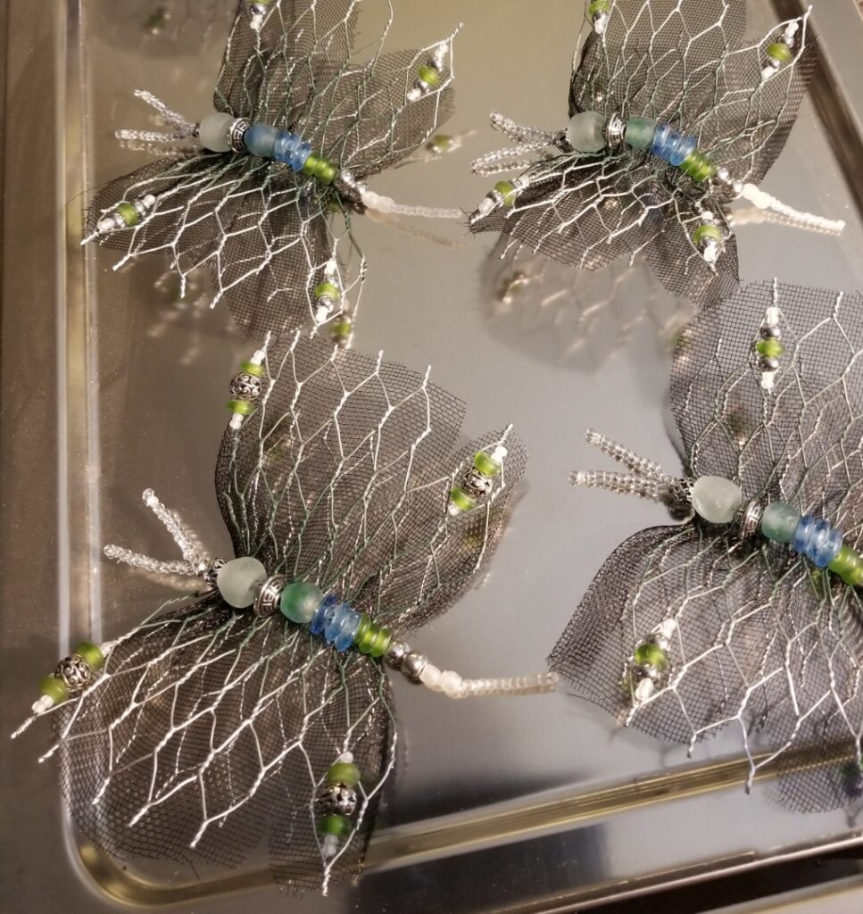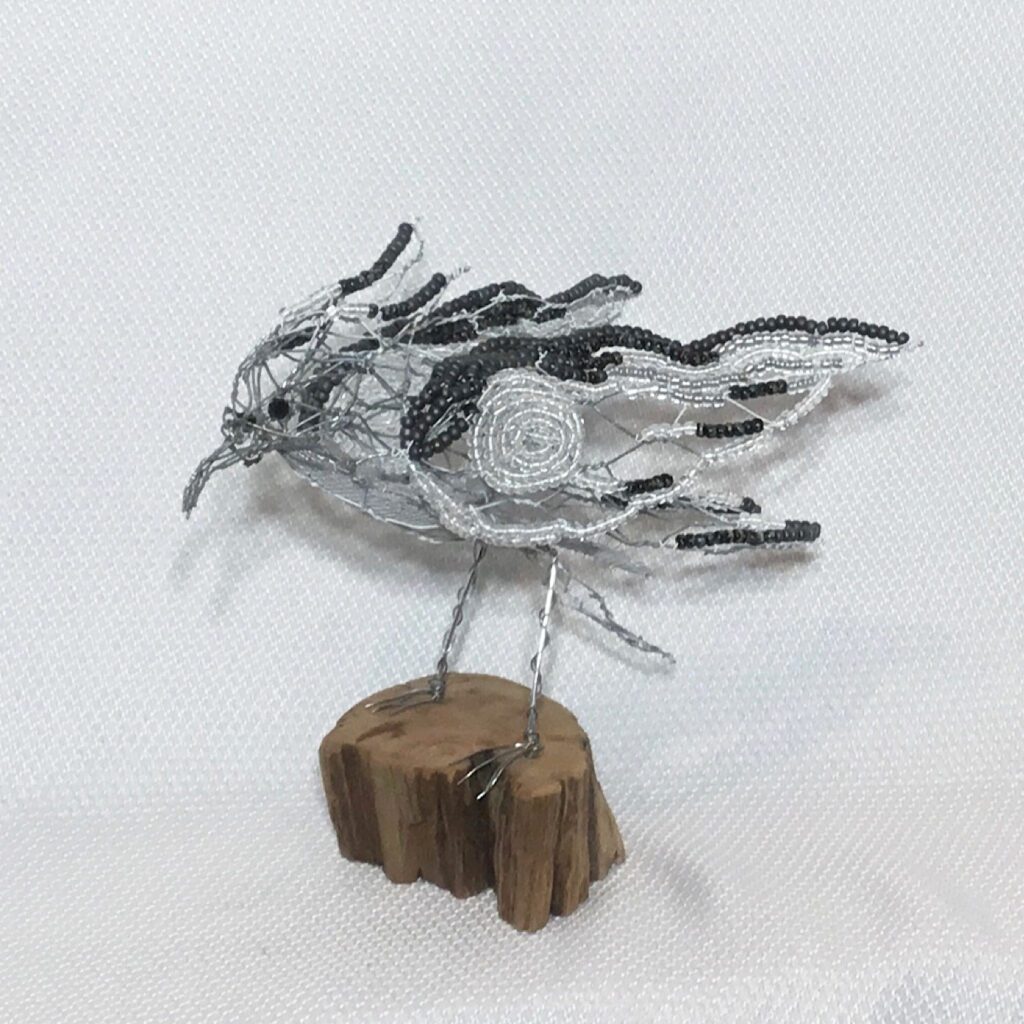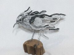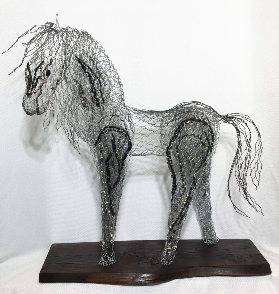 I create with 20 gauge Hex mesh wire. I mold and stretch the wire by hand, each piece takes on character as they evolve through the creative process. Animals with feathers ,fins, fur or mane, can appear to have flow, a sense of enchantment or action in the pose. I add driftwood, weathered wood, screen, faceted beads and natural crystals ,to give definition and details to the pieces.
