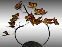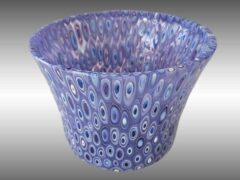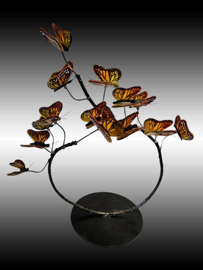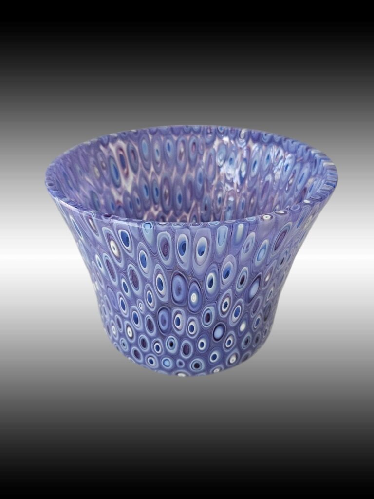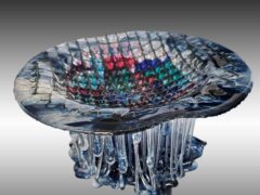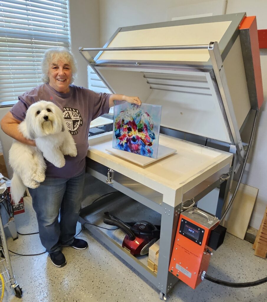I enjoy taking fused glass classes from a variety of instructors and taking what I learn and putting my own spin on it. My glass pieces start out as sheets of glass which are cut and layered to the desired design and I add accessory glass as desired. The glass is then melted together in a kiln at around 1450 degrees. Some of my pieces are fired in the kiln 4 or 5 times to get the desired effect. Many of my pieces are then “slumped” in the kiln to give them unique shapes. Many pieces also include one-of-a-kind stands I create.