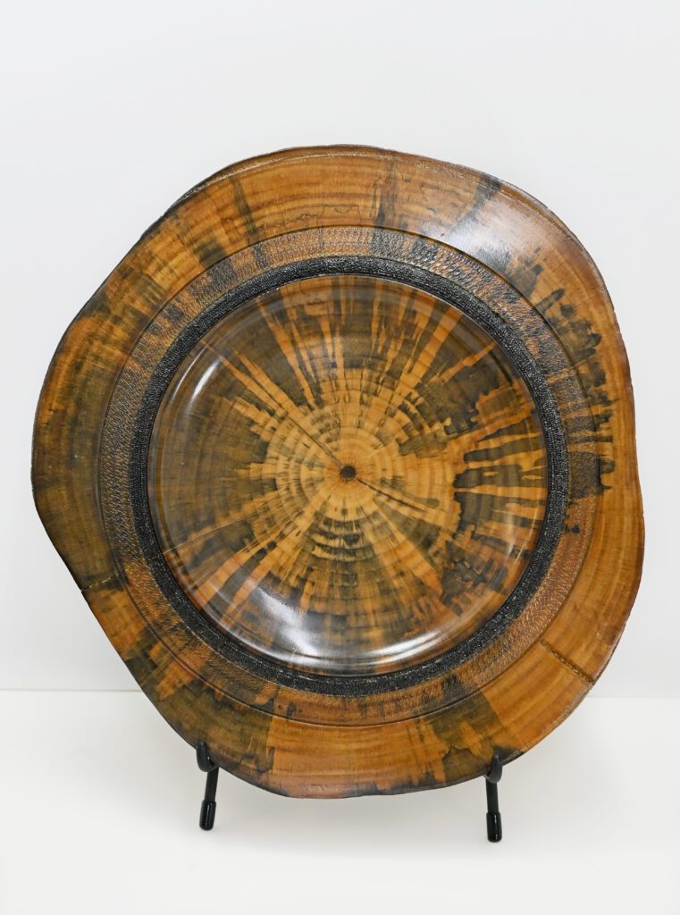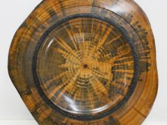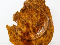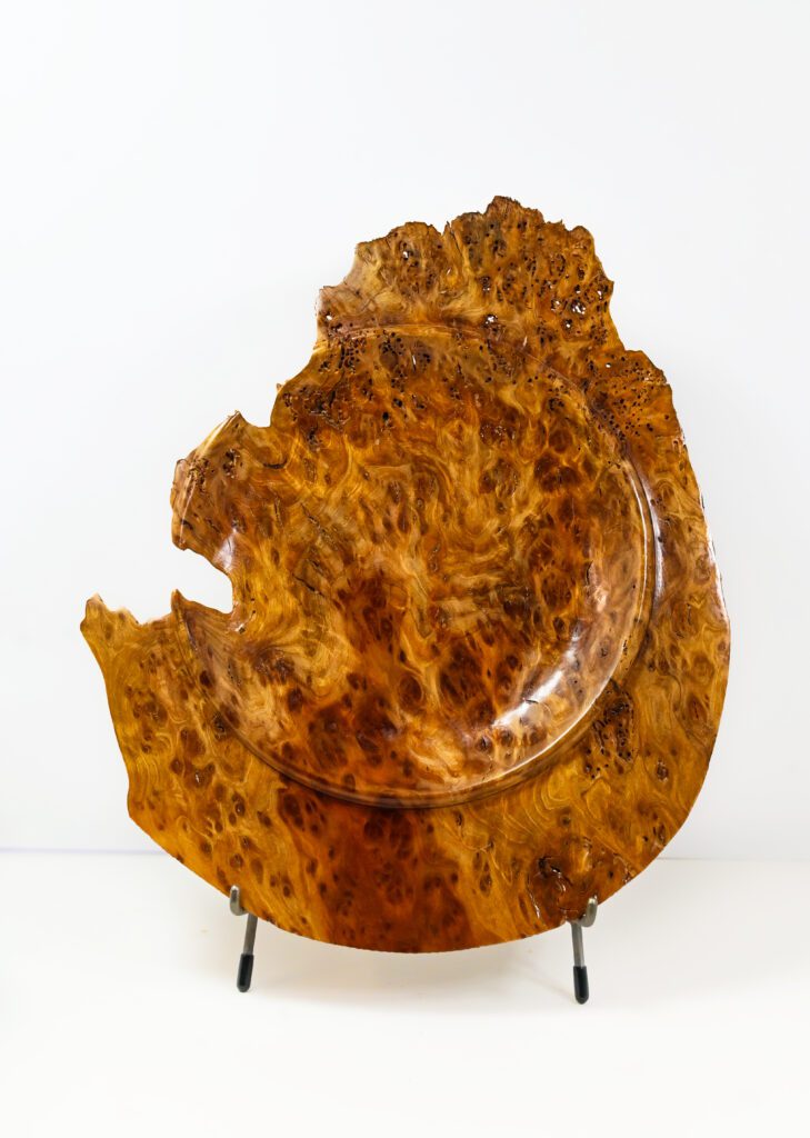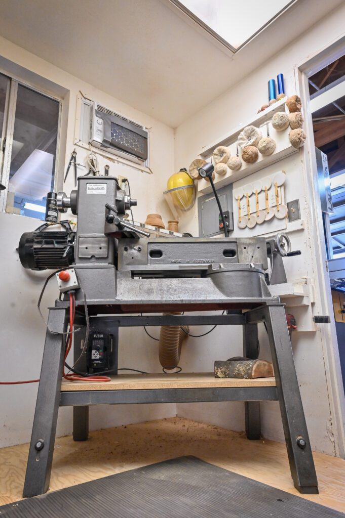 I have a small studio in my garage where I can control the dust and the temperature. I am on my 4th lathe. I now use a Robust Sweet 16. Along with various hand tools to turn my pieces. I have a Beall Buffing system, Which I find the most natural way to enhance the grain and color of the wood without altering it. Often the wood will determine the character of the piece and I just follow its lead. My wood all comes from trees that have either fallen or had to be taken down so the wood is not wasted.